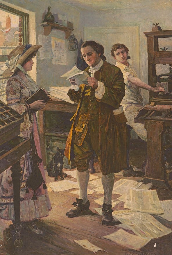 Franklin engineered a remarkable ascent. Born in Boston in 1706, the fifteenth of his father’s seventeen children, he was formally educated only to the age of ten because his vast numbers of siblings consumed the money that might have put Franklin through college and because Franklin’s father observed that a college education often did not lead to lucrative work. But although Franklin’s education ended early, he developed himself by extensive reading and by practicing his writing. His working years began in his father’s store and candlemaking business. Then, at age twelve, he became an apprentice for his brother, a printer.